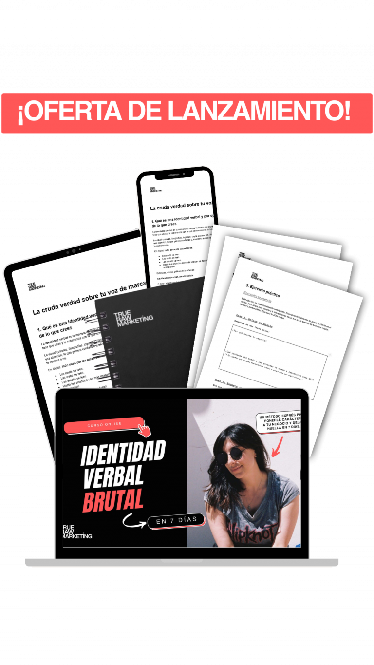 Lo sé. También he estado ahí. La mayoría de cursos se quedan en teoría, en fórmulas genéricas o en productos de entrada para venderte algo más premium como una mentoría o similar. Identidad Verbal Brutal es práctico y brutalmente aplicado: sales con tu identidad verbal definida y usable, no con un PDF olvidado en tu carpeta. Y no, no me interesa que después de hacer este curso te quedes con la sensación de que no sabes aplicar nada y tengas la «necesidad» de contratarme.